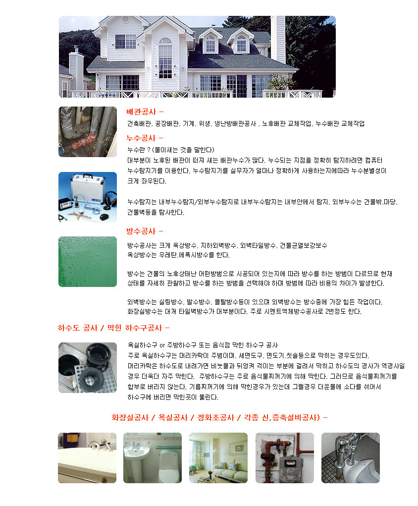 건설 (신/증축) 배관공사, 공장/상가배관공사, 누수공사, 방수공사, 화장실 개보수공사, 하수도공사, 막힌곳 뚫음, 각종 설비공사